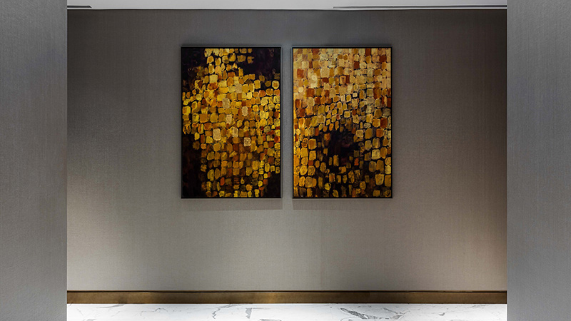To embody this, we used gold lines to illustrate the movement of energy. We wanted to use the gold lines and elements of gold leaf to bring the paintings together as a collection, but more importantly, the gold in each artwork represents this idea that, as guests pass through the hotel, they leave their own trail of energy in this iconic building, therefore, adding to its life force.
